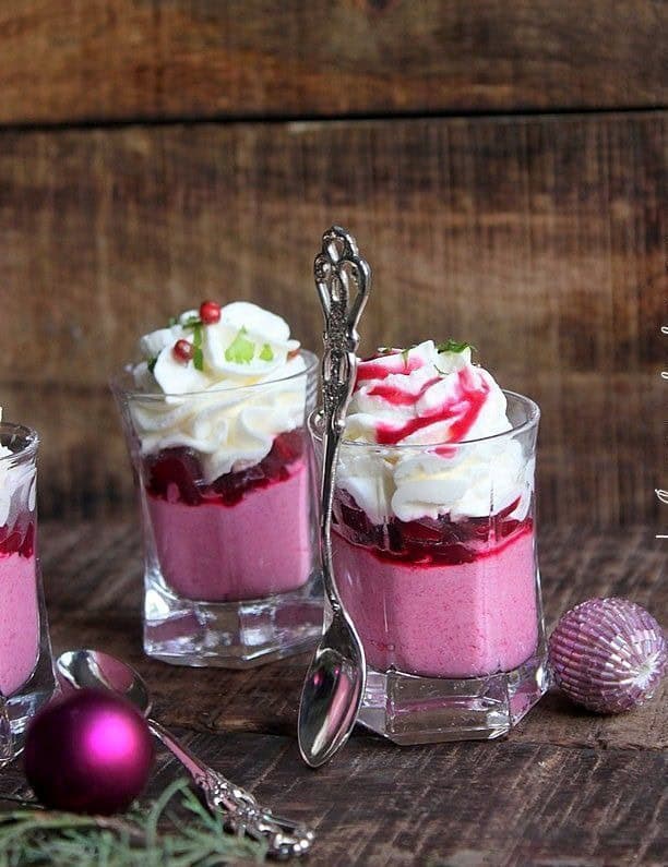 Répartir la mousse aux fromages dans les verrines, puis déposer les dés de betterave et finir en décorant avec la chantilly.